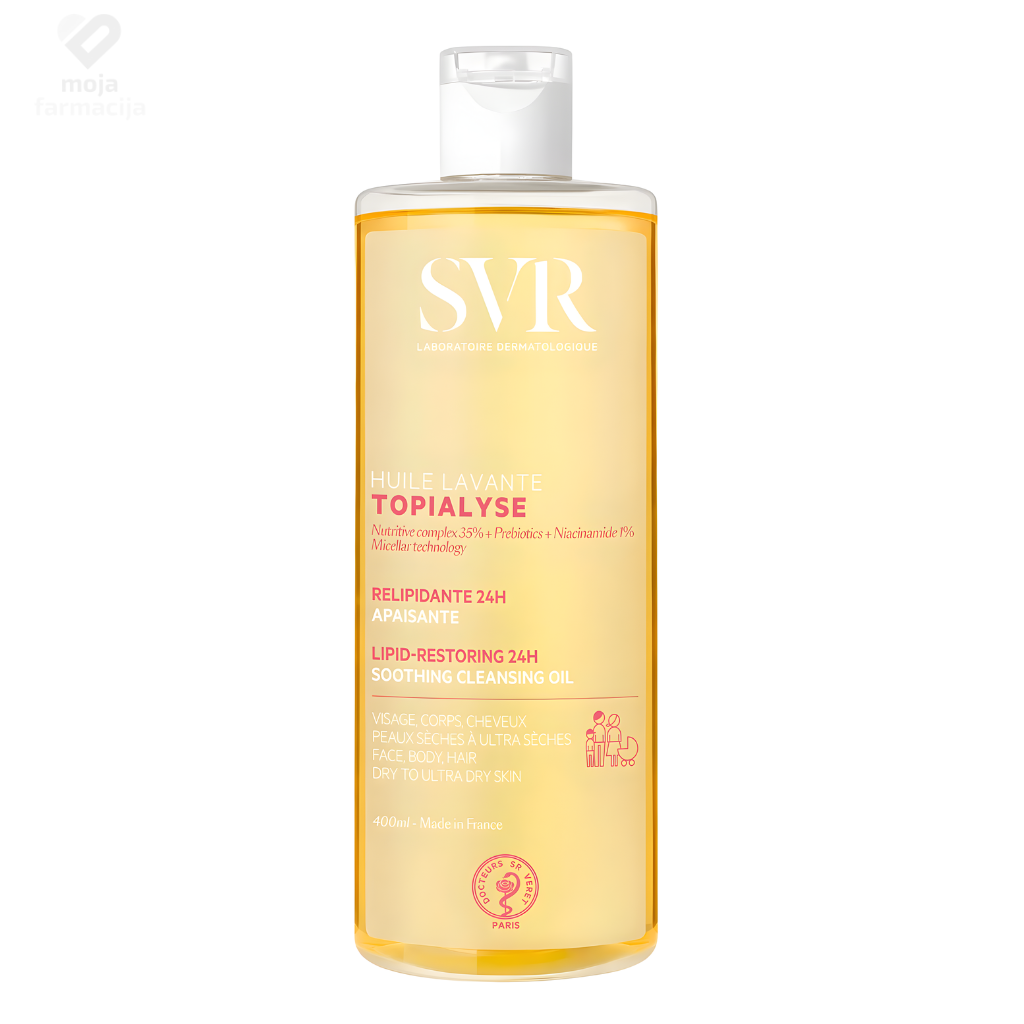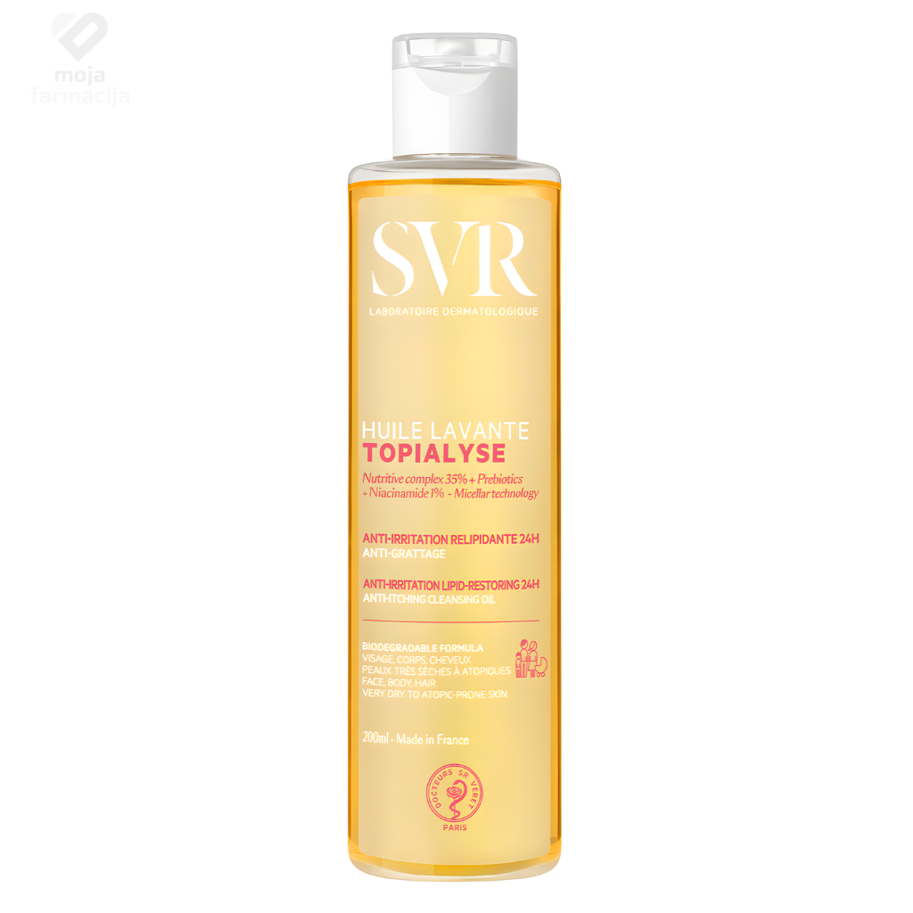 SVR Topialyse Ulje za tuširanje je posebno formulirano ulje-sindet dizajnirano za vrlo suhu, iritiranu i atopiji sklonu kožu svih dobi — od novorođenčadi do odraslih. Sa visokom koncentracijom hranjivih sastojaka i umirujućim niacinamidom, ovo ulje nježno čisti bez sapuna, štiti lipidni sloj kože, smanjuje osjećaj svrbeža i zatezanja, te vraća osjećaj udobnosti i mekoće.